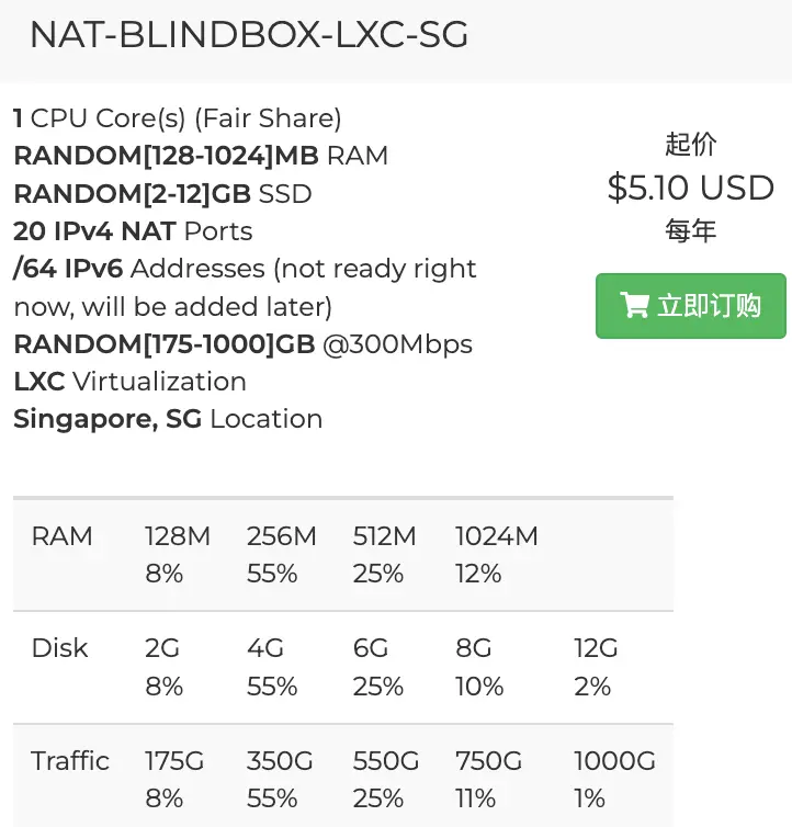 ByteVirt,国人商家,主要提供各类VPS和独立服务器,VPS多数为共享IPv4,独立IPv6。下面是这次五一放出的新加坡IPv4 NAT的盲盒 VPS。