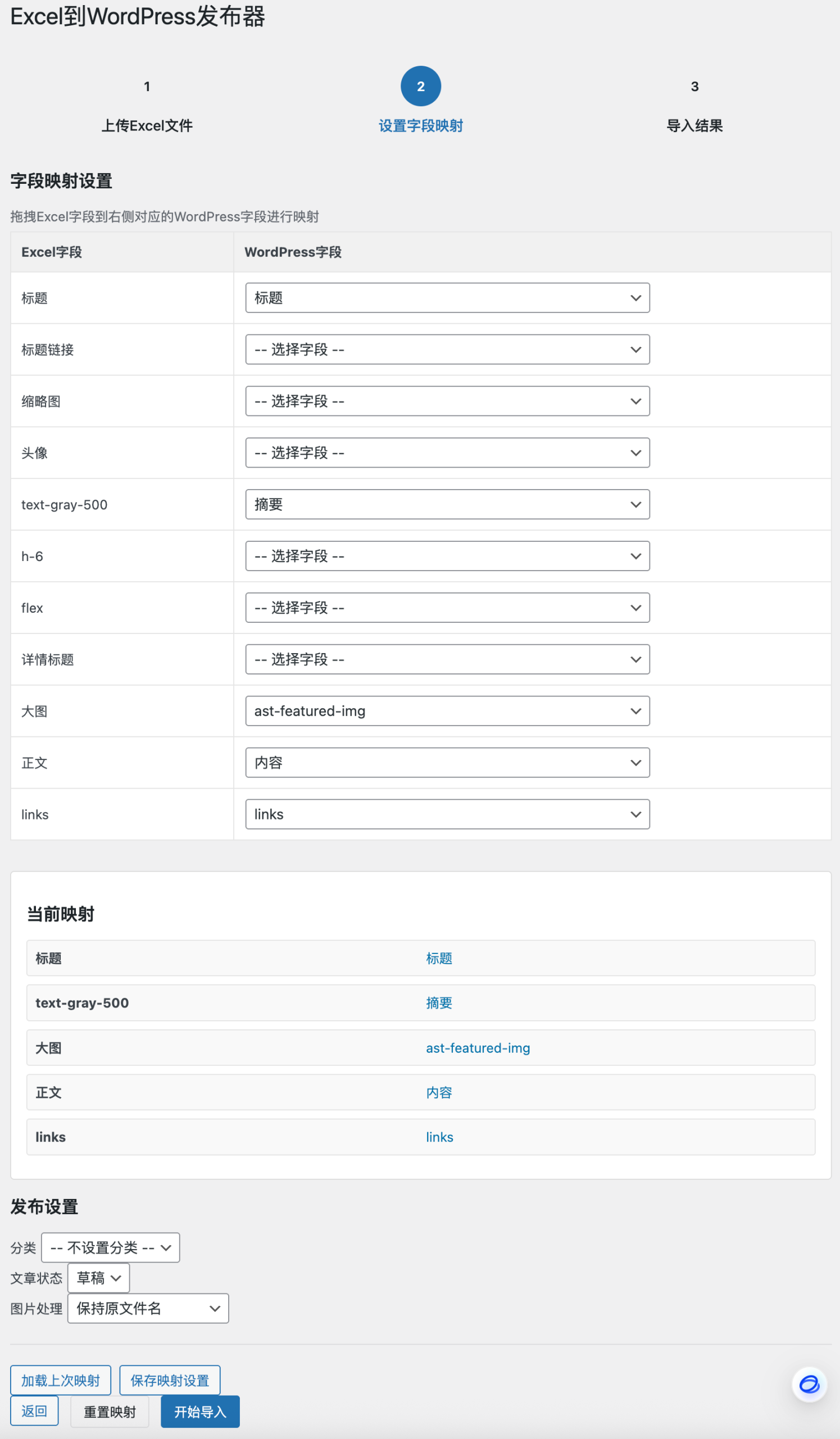 2.设置字段映射,选择发布的分类和文章状态、图片处理方式等,开始导入