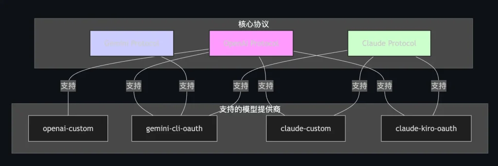 - OpenAI 协议 (P_OPENAI): 支持所有 MODEL_PROVIDER,包括 openai-custom、gemini-cli-oauth、claude-custom 和 claude-kiro-oauth。