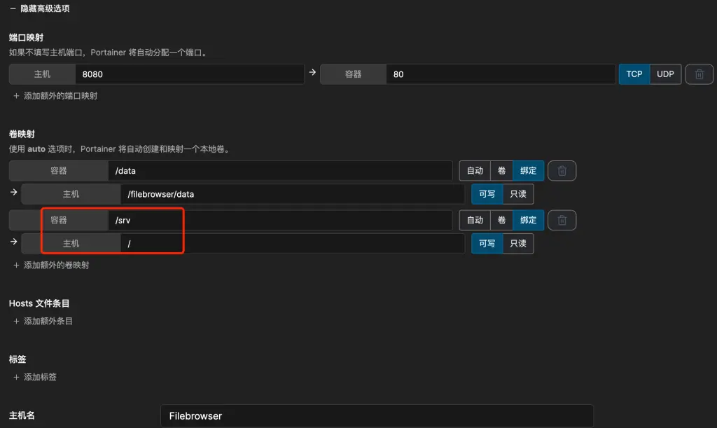 如果你是用Portainer来安装的话,只需要进行如下的卷映射即可: