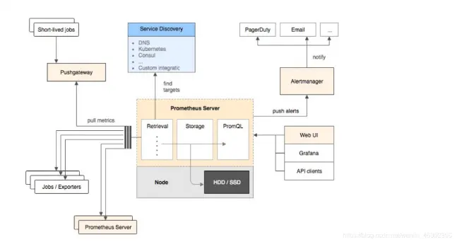 Prometheus基本原理是通过HTTP协议周期性抓取被监控组件的状态,这样做的好处是任意组件只要提供HTTP接口就可以接入监控系统,不需要任何SDK或者其他的集成过程。这样做非常适合虚拟化环境比如VM或者Docker。