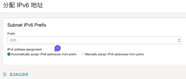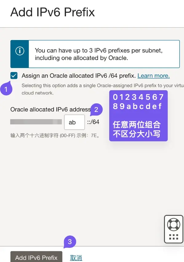 5.在弹出的界面中勾选Assign an Oracle allocated IPv6 /64 prefix 在下面的输入框中输入2位16进制的代码