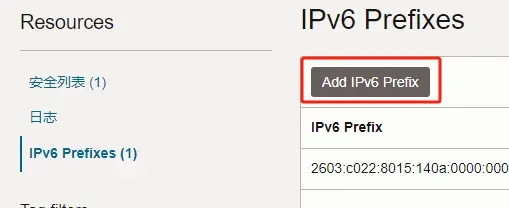 4.在做侧边栏中找到IPv6 Prefixes 进入并在右侧界面中点击Add IPv6 Prefix。